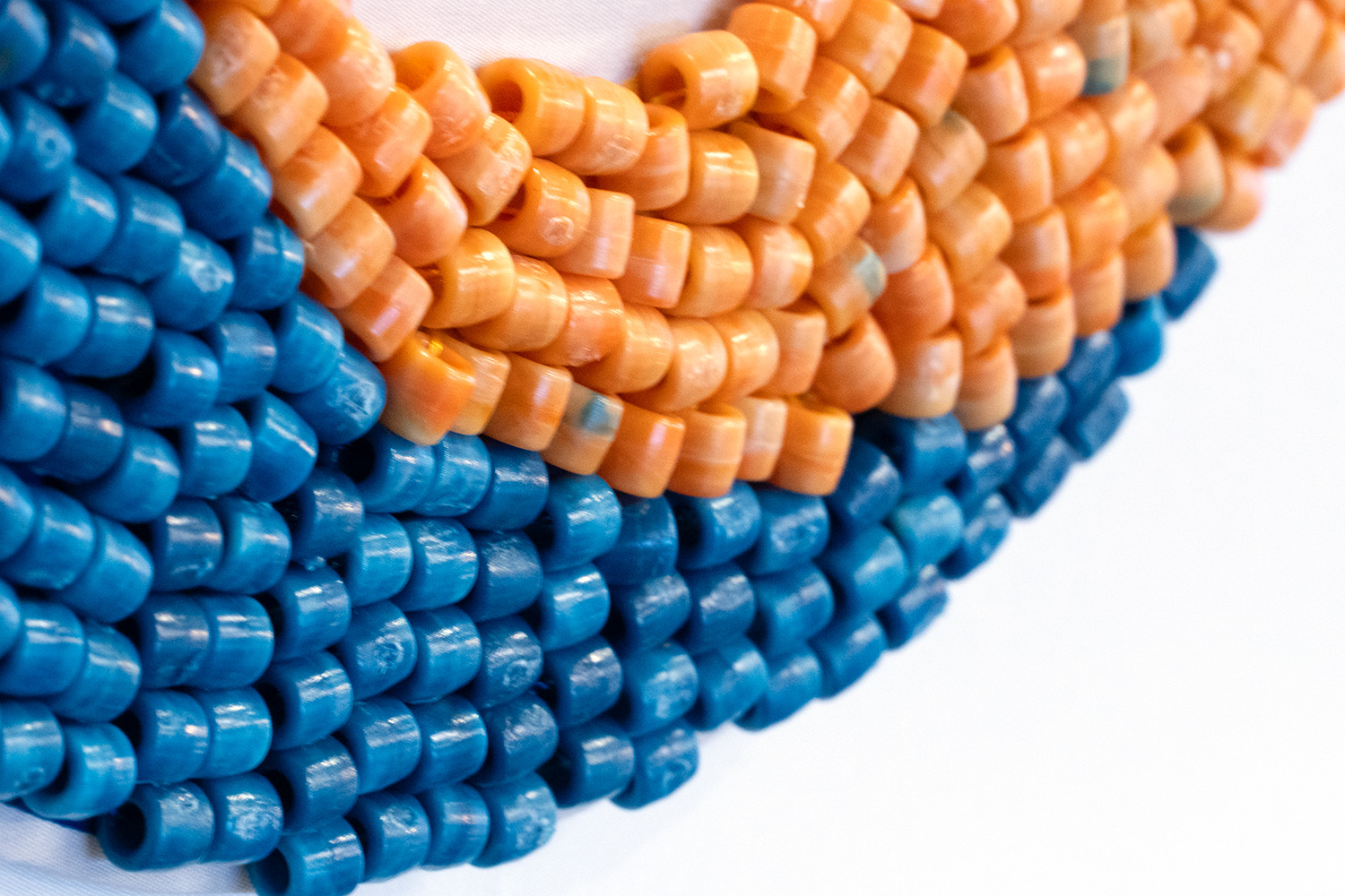 また、ロゴ部分については、弊社が海洋プラスチックから成形したビーズを使用し、東レ合繊クラスター会員企業の皆様ご自身の手で縫い付けていただき、ロゴの形へと完成させました。