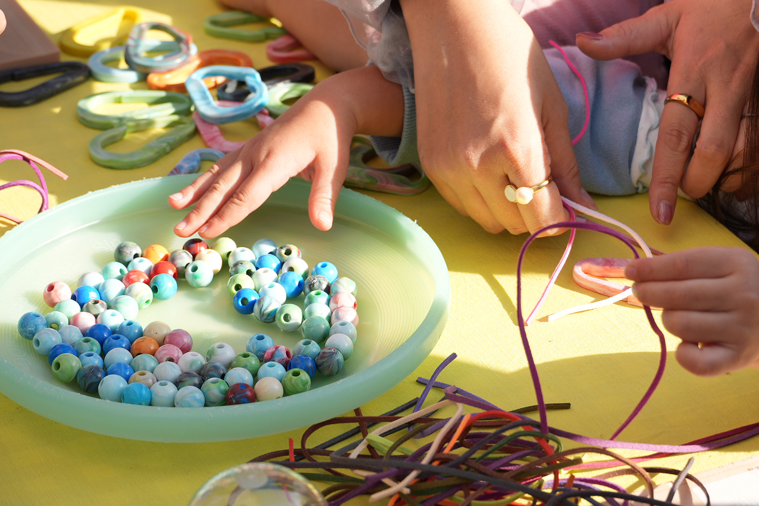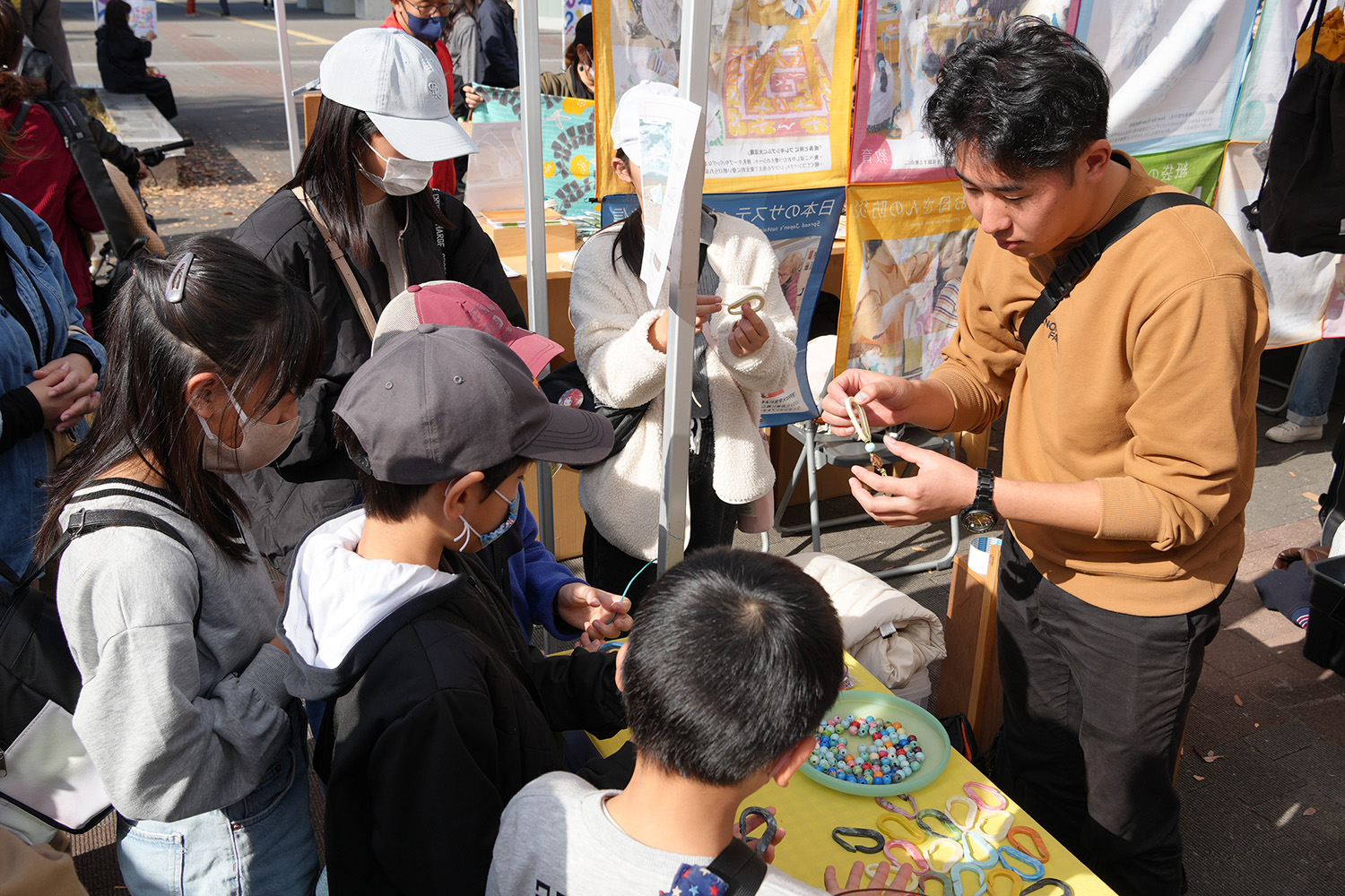 福井県立大学 海洋生物資源学部、そして京都工芸繊維大学 建築の学生スタッフの皆様と一緒に、海洋プラスチックやペットボトルキャップを活用したアップサイクル体験を実施。カラビナキーホルダー作りを中心に、「自分の手でつくる」楽しさと、「ごみが素材に変わる」驚きを感じて頂きました。