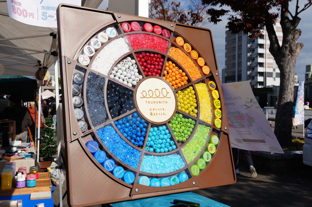 特に、ペットボトルキャップを色ごとに分けて見せる展示や、粉砕→成形の流れが一目でわかる”アップサイクルボード”は、通りがかった方の目を惹きやすく、「これがこうなるんだ!」と立ち止まって見てくれる方が多かったのが印象的でした。仕組みが見えると、体験の納得感がぐっと増える。改めて、展示の力も実感致しました。
